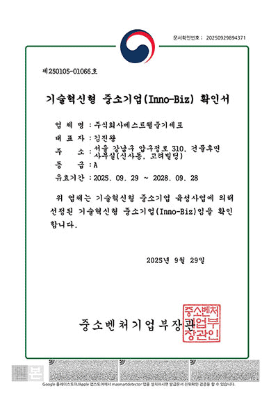 국가인증 피부과학기술 및 성체줄기세포 바이오모듈에이션 분야 이노비즈 A등급 획득